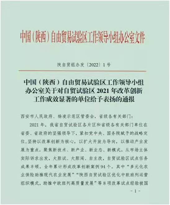 在中国(陕西)自由贸易试验区杨凌片区成立五周年之际,又传来了好消息,杨凌自贸片区改革创新工作获全省通报表扬。