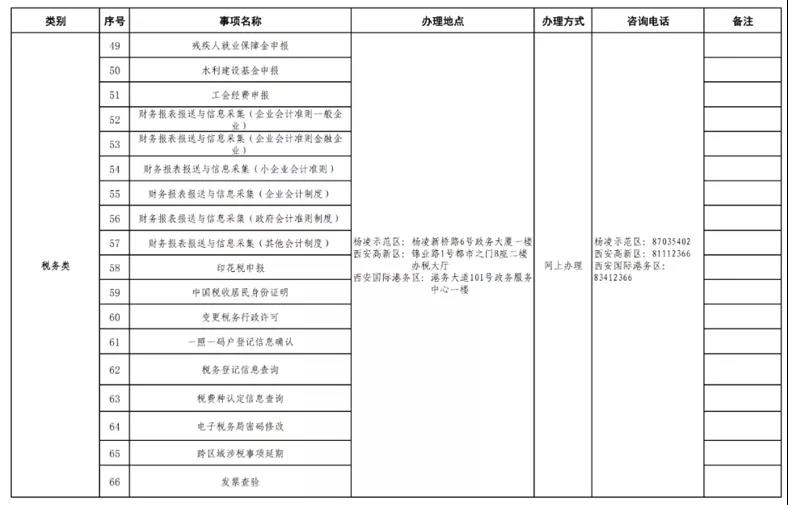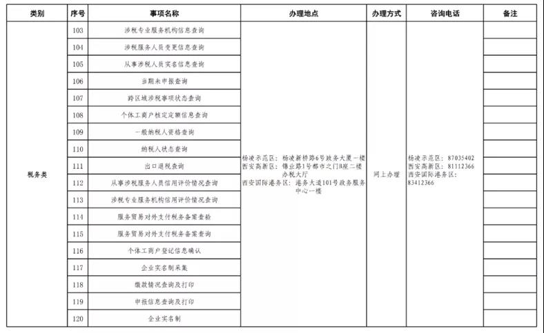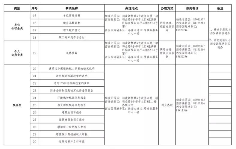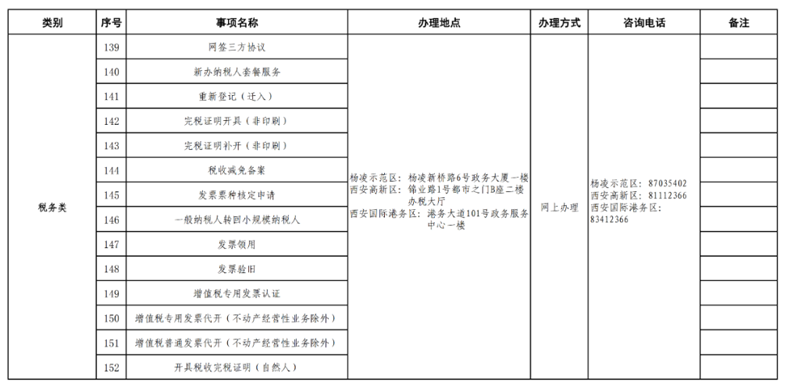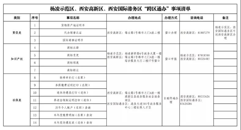 记者在杨凌示范区、西安高新区、西安国际港务区“跨区通办”事项清单(第一批)上看到,152项政务服务事项与群众、企业密切相关,包括贸促类、知识产权类、社保类、单位公积金类、个人公积金类、税务类6大类行政审批服务。目前已统一跨区域办理标准,明确通办事项的名称、办理时限、服务标准、审批流程等。大家可就近采取窗口直接办理、自助终端办理和网上办理等方式办理。