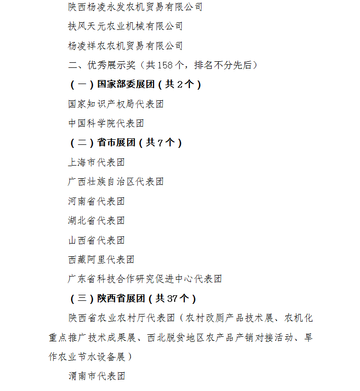 以“科技创新引领乡村振兴”为主题的第28届杨凌农高会于10月22日至26日成功举办。为期5天的会期里,各国家部委、省市代表团和机构企业等积极组织展团参展参会、促成交易,取得了显著的成绩,获得了满满的收益。经农高会组委会审议,评出57个优秀组织奖,158个优秀展示奖,16个优秀成交奖,18个优秀服务奖,现将名单予以公布。