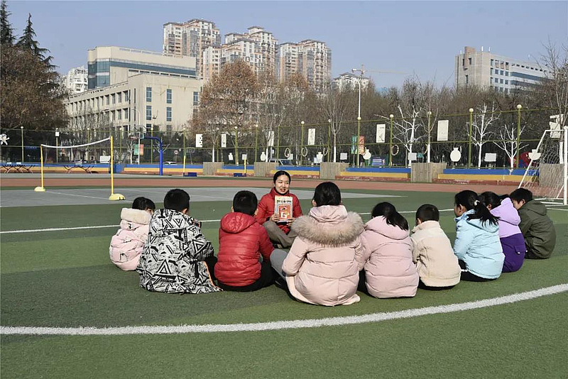 冬日的阳光照在操场上,西北农林科技大学综合素质教育学院副教授刘威老师正绘声绘色讲起绘本故事,孩子们围坐在一起听得认真。