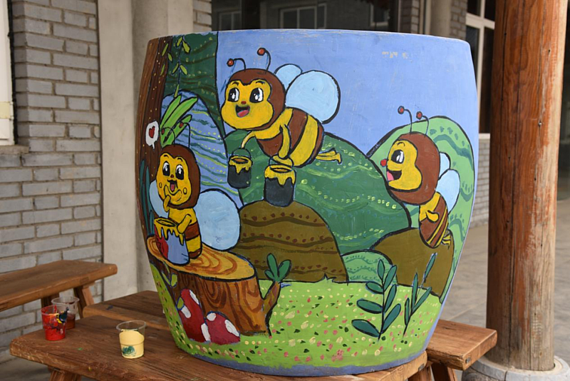 蓝天白云下,农民抱着丰收的果实喜笑颜开;一辆满载农作物的三轮车在田间地头“奔跑”,一派农忙的景象;一群蜜蜂在花丛中翩翩起舞,争相为花朵授粉……5月31日,记者来到杨陵区五泉镇王上村,只见一个个表层被涂上各种创意画作的花钵整齐摆放在村委会院内,艺术气息扑面而来。
