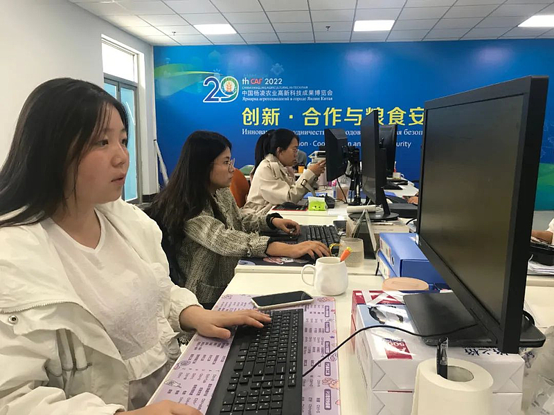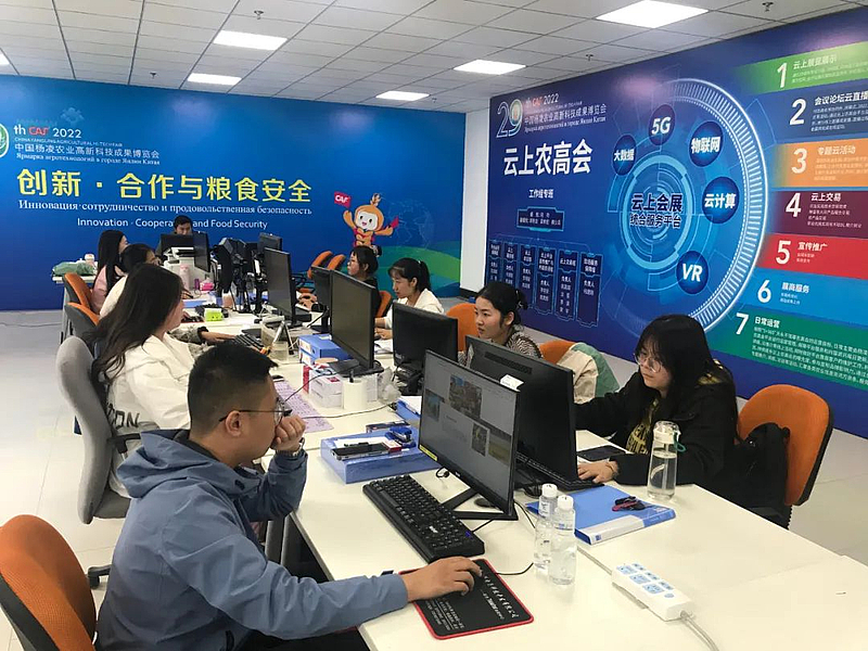 8月30日,记者来到位于农高会C馆的“云上农高会”内容运营及展商服务组办公室,10多名组员坐在电脑前,或敲击键盘,或电话不断,大家紧张有序地忙碌着。