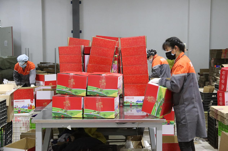 晚6:30,在杨凌示范区电商公共服务中心,甘福园产品分选线上,100多名工人分成多个小组,正在加紧分装阿克苏糖心苹果的包裹;