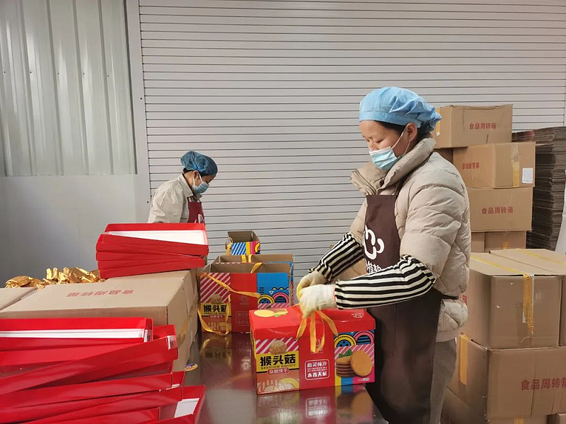 而包装车间内更是弥漫着十足的年味,核桃酥、手撕面包、猴头菇等不同种类的礼品盒整齐地摆放着,160余位工人相互协作,手脚麻利地将不同种类的成品糕点装进礼盒,为备足新年物资做足准备。