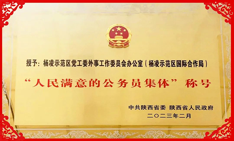 2月21日,省委、省政府决定,授予雷俊生等50名同志陕西省“人民满意的公务员”称号(享受省部级表彰奖励获得者待遇),授予西安市莲湖区行政审批服务局等24个集体陕西省“人民满意的公务员集体”称号。其中,杨凌示范区党工委外事工作委员会办公室(杨凌示范区国际合作局)(以下简称杨凌示范区党工委外办)获评陕西省“人民满意的公务员集体”。