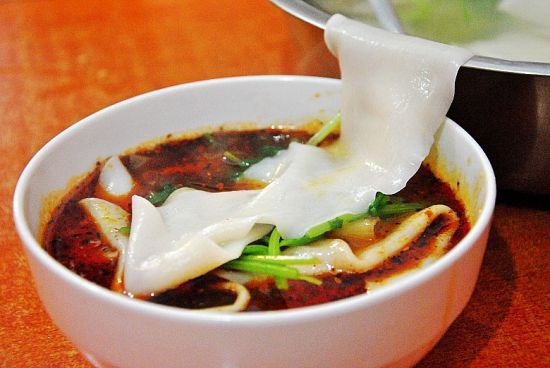 一盆清透的面汤中,热气腾腾的沉浮着几根长面,碧绿的青菜叶点缀其中,看上去清白分明,很是清爽。白皙柔软的面条在五彩斑斓、口感丰富的蘸汁中一蘸,“吸溜”一口,口齿间不仅充斥着酸辣咸香,面香味儿也令人回味无穷。