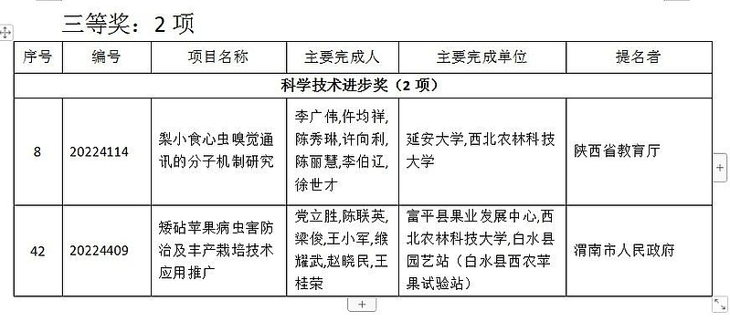 近日,陕西省人民政府下发了《关于2022年度陕西省科学技术奖励的决定》,全省共授予260项科技成果和8名科研人员省科学技术奖励,其中,杨凌示范区12项科技成果获2022年度陕西省科学技术奖励,其中一等奖3项、二等奖7项、三等奖2项。