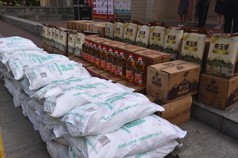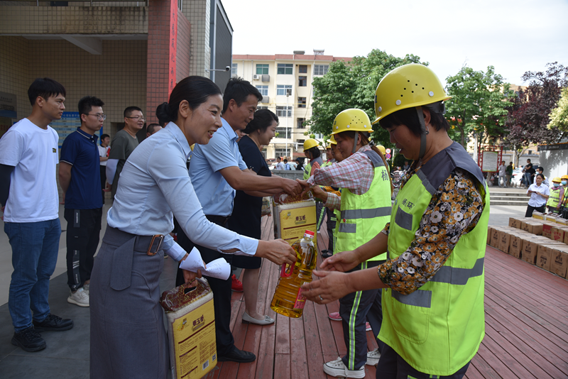 活动现场,与会领导为9名环卫工代表发放了米、面、油等慰问品,并与她们进行亲切交谈,了解她们的工作生活情况,嘱咐她们要注意防暑降温。同时,为爱心企业、爱心人士颁发捐赠牌。