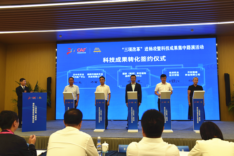 活动现场,西北农林科技大学、杨凌职业技术学院、汉中市农业技术推广与培训中心、陕西诺威利华生物科技有限公司等高校、科研院所、企业签订了科技成果转化协议。西北农林科技大学、西安科技大学、陕西师范大学、西北大学、长安大学的5个项目进行了路演。