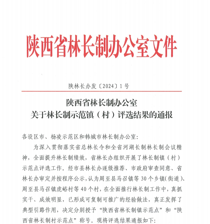 日前,陕西省林长制办公室印发《关于林长制示范镇(村)评选结果的通报》(陕林办发〔2024〕1号),其中,杨陵区揉谷镇获评全省林长制示范镇,杨陵区大寨街道办杜寨村获评全省林长制示范村。