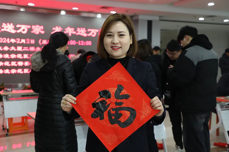 活动现场,长桌排开,红幅铺展,墨香飘溢,气氛热烈。只见书法家们笔锋婉转,妙句成双:“龙腾虎跃千家喜,雨顺风调万户春”“迎春迎福迎富贵,接财接福接平安”“天增岁月人增寿,春满乾坤福满楼”……不一会儿功夫,一幅幅寓意吉祥的春联和一个个饱含神韵的“福”字就依次送入人们手中,也让大家在热闹祥和的氛围中提前感受到浓浓的“年味”。