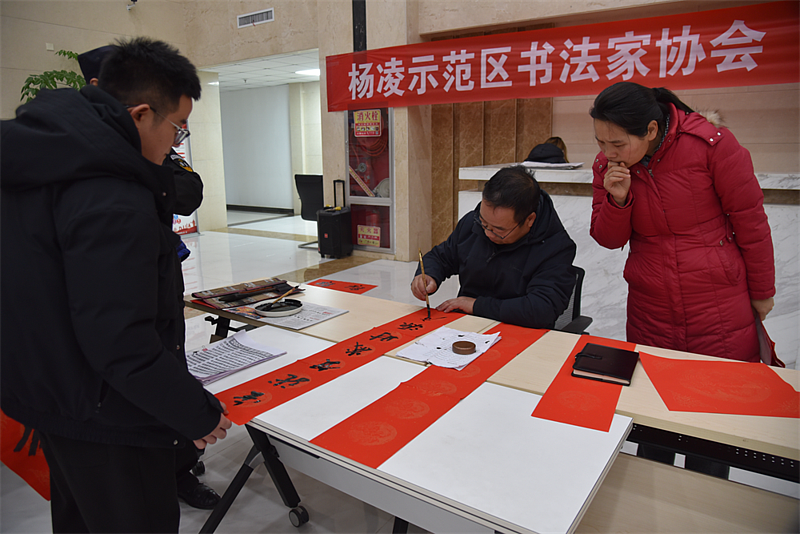“我们响应示范区、杨陵区两级文化和旅游体育局的号召,在全区进社区、进学校、进机关、进乡村、进企业,给全区广大职工干部和群众送去新年的问候,希望大家过个欢乐祥和的春节。”杨凌示范区书法家协会主席高掌平告诉记者。
