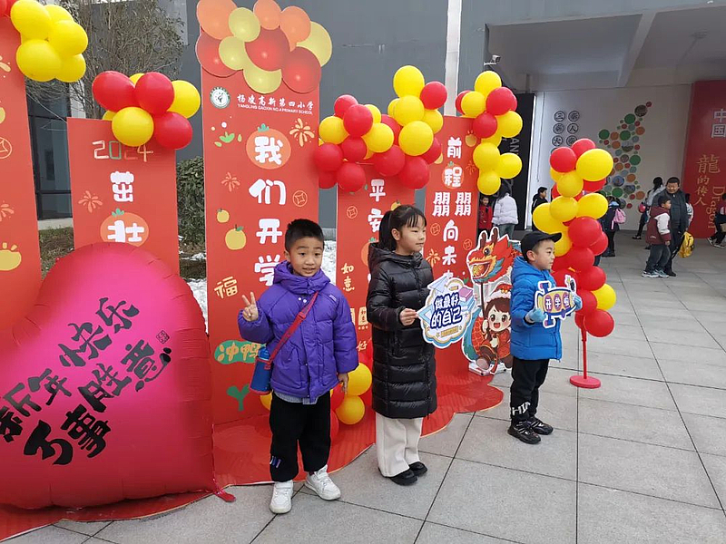 龙年校园换新颜。一走进高新四小校门,“龙行龘龘启新篇,前程朤朤向未来,欢迎同学们回校”几个大字在电子屏上滚动播出。在校门口,学校老师列队迎接学生们归来。校园内,迎新吉祥物,开学背景墙,龙年花灯展、风铃展等学生作品展,以及游戏《鱼跃龙门》等活动,聚足了人气,让新学期的欢乐气息扑面而来。