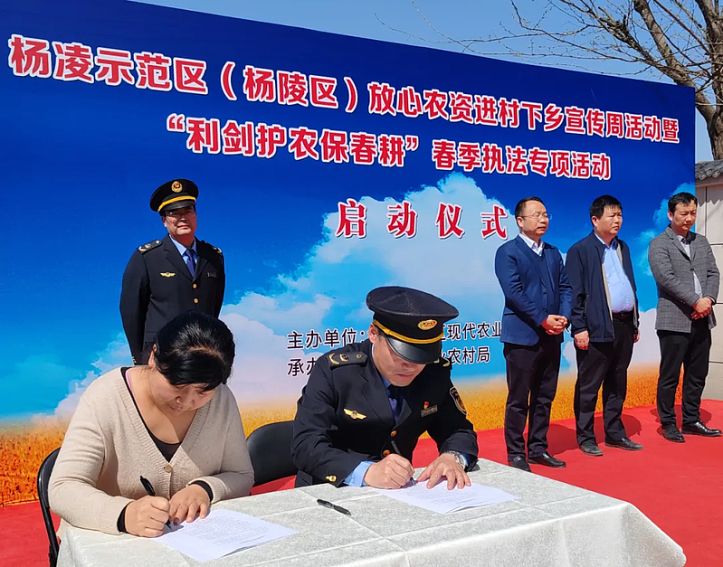 3月28日,杨凌示范区(杨陵区)2024年放心农资进村下乡宣传周活动暨“利剑护农保春耕”春季执法专项行动启动仪式在杨凌种子市场举行。
