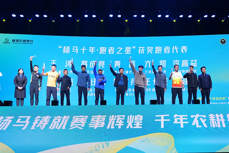会议现场,杨凌农科城马拉松赛组委会还为历届“杨马”冠军代表、跑友代表、赞助商代表、媒体代表、志愿者代表、公益团队代表颁发了“杨马十年·勇者向前”系列奖杯。