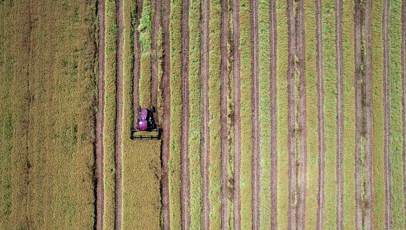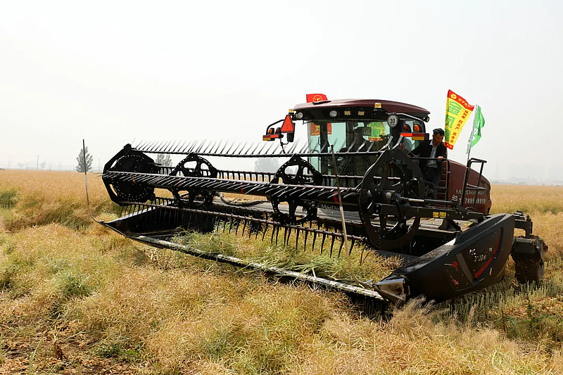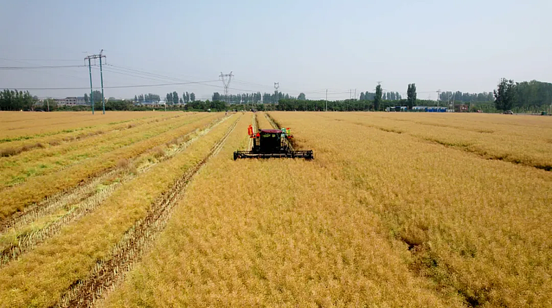 5月26日,河南省新乡市凤泉区大块镇东庄村的6000亩油菜喜获丰收。金灿灿的油菜荚颗粒饱满、压弯枝干。种植户正用大型机械收割、捡拾,确保颗粒归仓。