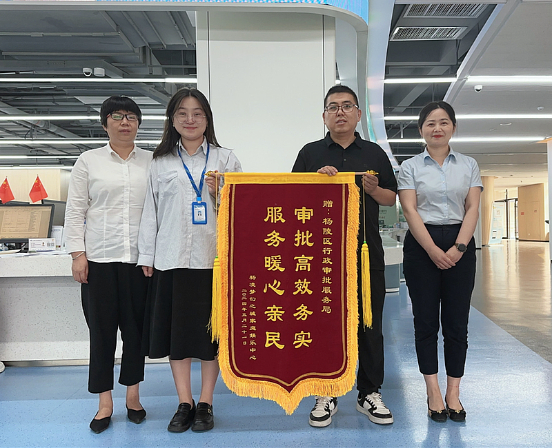 日前,杨凌一家文化娱乐企业的工作人员向杨陵区行政审批局送来一面上书“审批高效务实,服务暖心亲民”的锦旗,对该局工作人员在相关业务办理过程中提供的高效审批和靠前服务表示感谢。