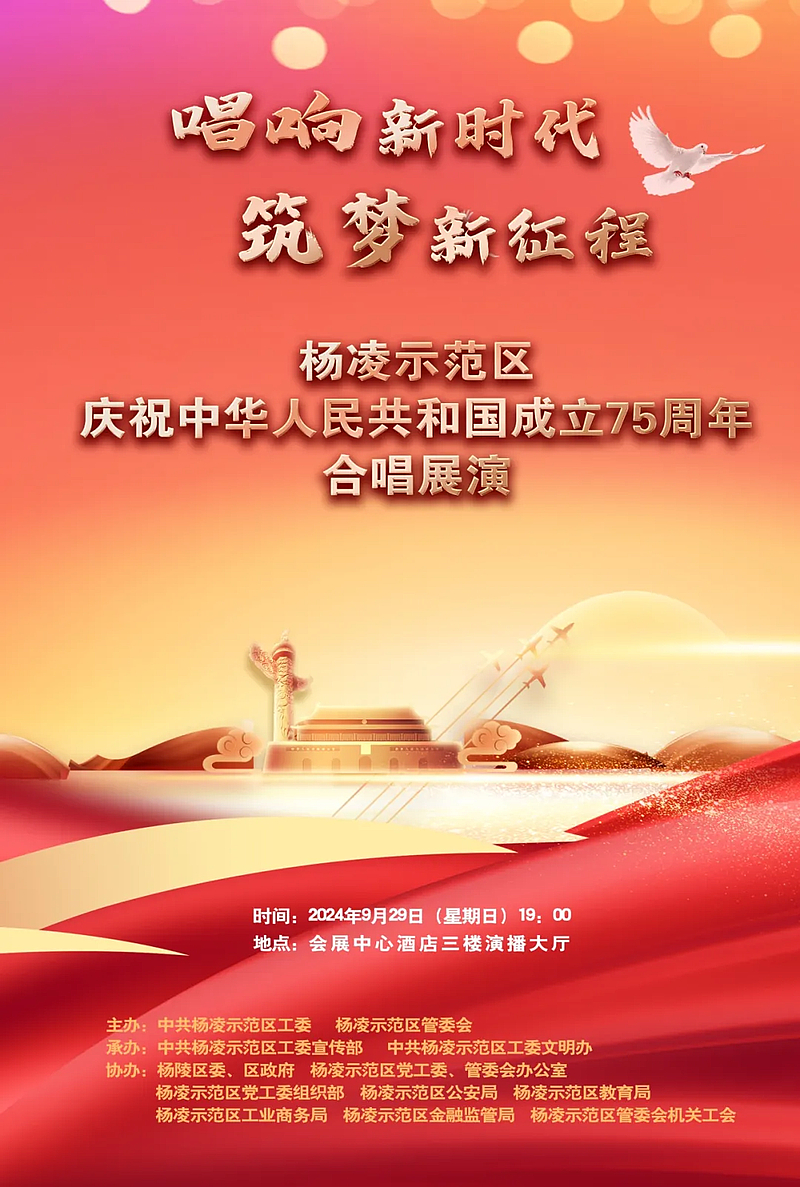 七十五载风雨兼程,七十五载波澜壮阔。在举国欢庆中华人民共和国成立七十五周年之际,杨凌示范区庆祝中华人民共和国成立75周年合唱展演活动,将于9月29日19:00在杨凌会展中心酒店三楼演播大厅举办。
