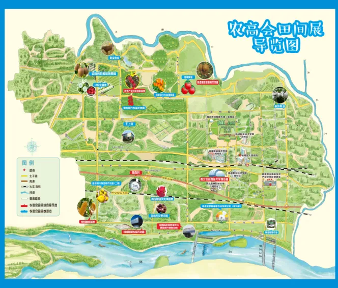 农高会展馆区—农高会农业技术田间推广展(7个田间综合展示点)—农高会农业技术田间推广展(13个田间参观点)—尚特梅斯庄园—杨凌蘸水面街区