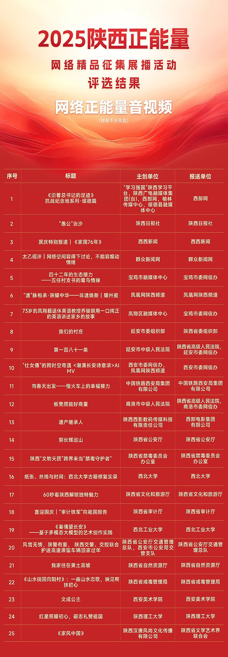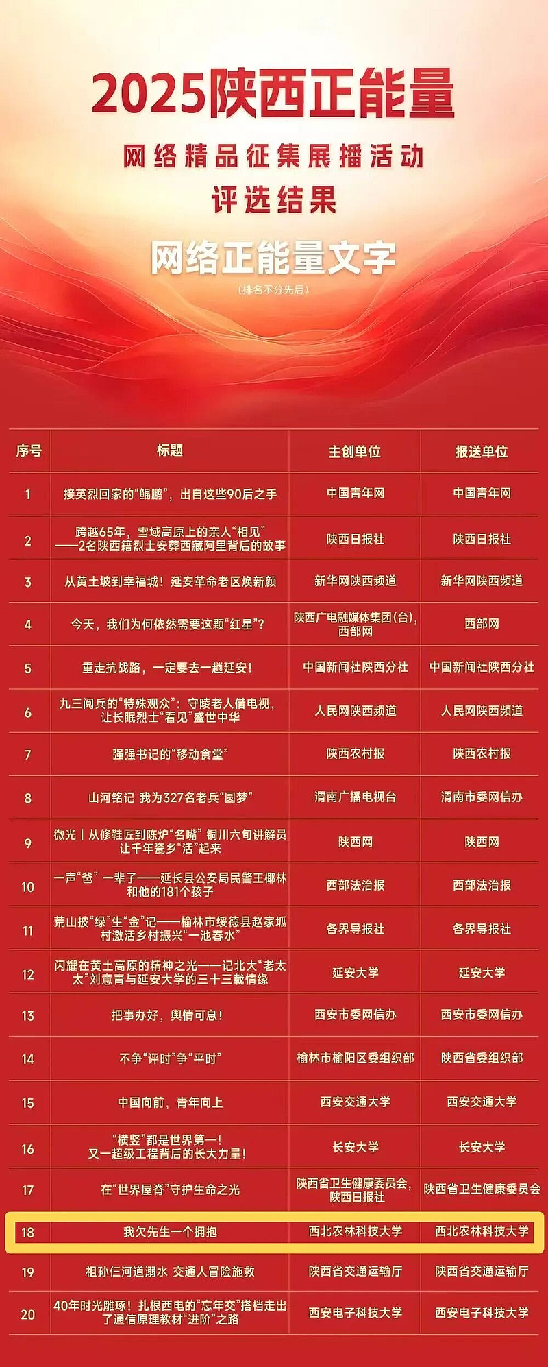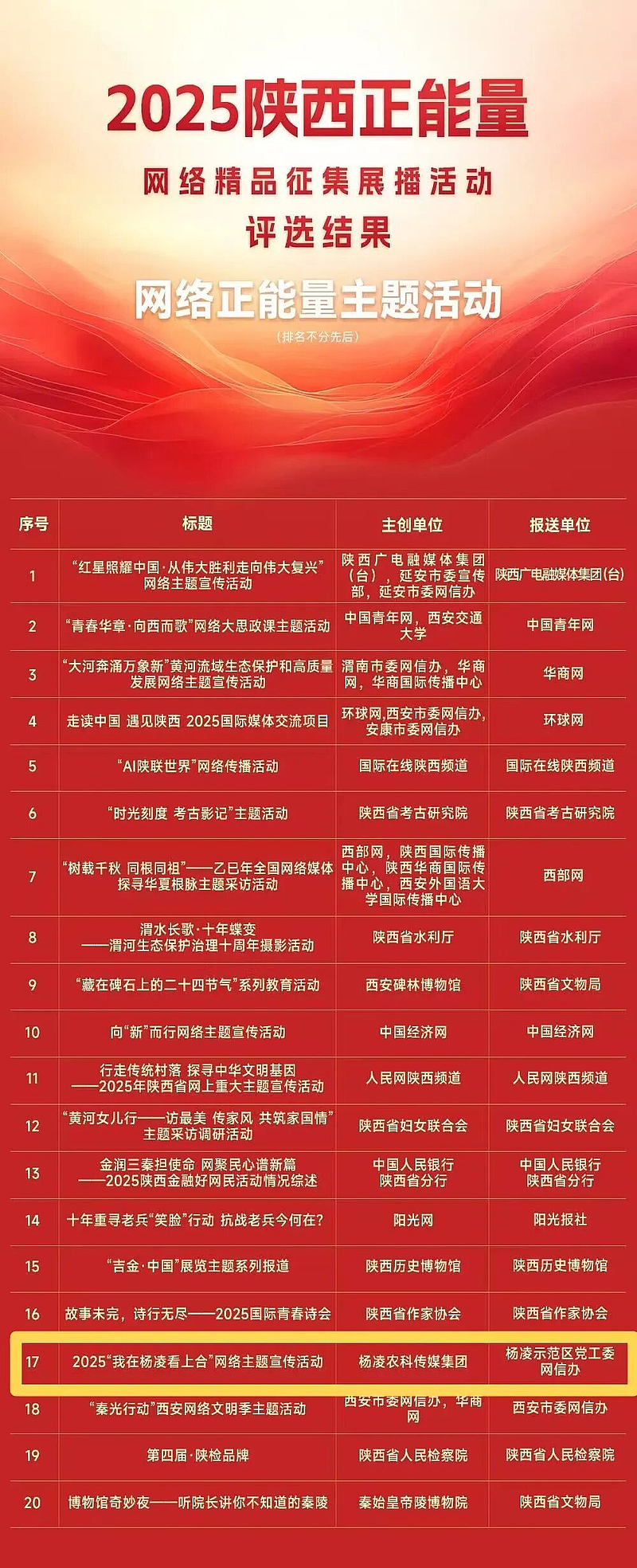 日前,陕西省委网信办发布2025陕西正能量网络精品征集展播活动评选结果,经作品征集、评审、公示等环节,评选出了100件网民认可、社会认同、影响广泛的网络精品。其中,杨凌示范区共有3件作品入选分别是西北农林科技大学主创的我欠先生一个拥抱、杨凌农科传媒集团主创的我在中国学农技、2025“我在杨凌看上合”。网络主题宣传活动完整名单如下: