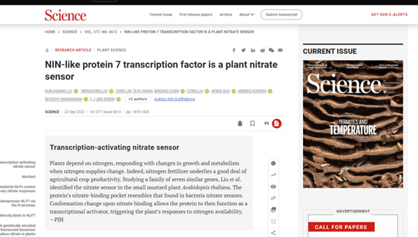 9月23日,西北农林科技大学生命学院刘坤祥教授领衔的植物氮素营养团队的研究成果《NLP7转录因子是植物的一个硝酸盐受体》在《科学》在线发表。这是西北农林科技大学继7月份在《细胞》发表重要研究之后的又一重大成果。