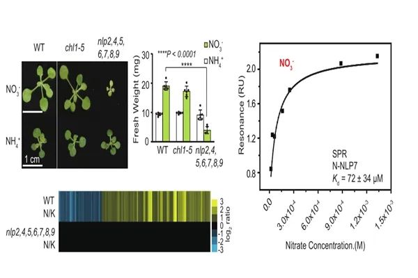 该研究的创新点在于:一是发现了NLP7蛋白除了是硝态氮信号途径的转录因子,还具有硝酸盐受体的作用,这不同于以往在细胞膜上发现的硝酸盐受体;二是开发了荧光硝酸盐感受器,方便在细胞水平观察到植物体内硝酸盐的含量和变化。该研究结果的重大意义在于阐明了光合自养植物通过感受硝态氮进而激活植物信号转导网络和生长反应的调节机制,这一发现将为提高作物的氮利用效率,减少化肥使用和能源消耗,减轻由温室气体排放引起的气候变化,进而为支持农业的可持续发展提供新的启迪。