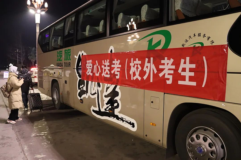 凌晨6:40,穿过漆黑的夜色,各个乘车点的学工干部早早就进入工作岗位。天虽寒,服务却暖。老师们引导学生有序上车,一遍又一遍清点人数,确保不漏一人。提醒大家核对考场信息、检查所需证件、考试用具是否备齐,鼓励考生放平心态、沉着应考。