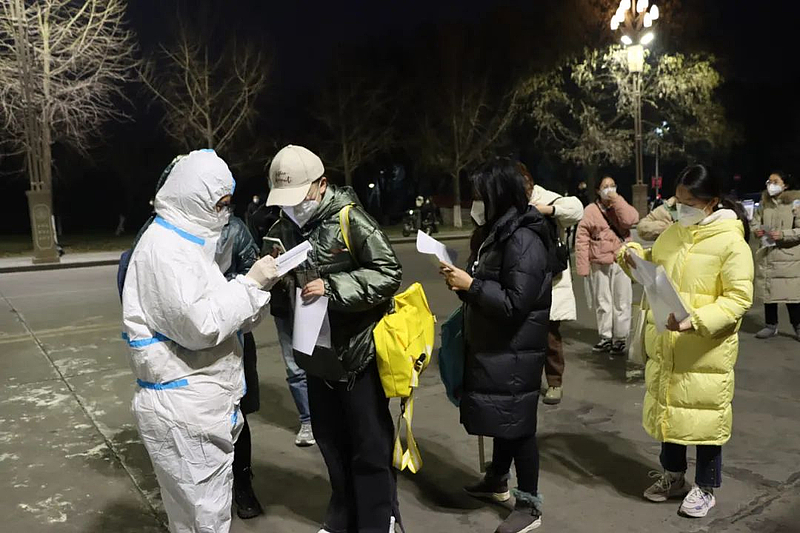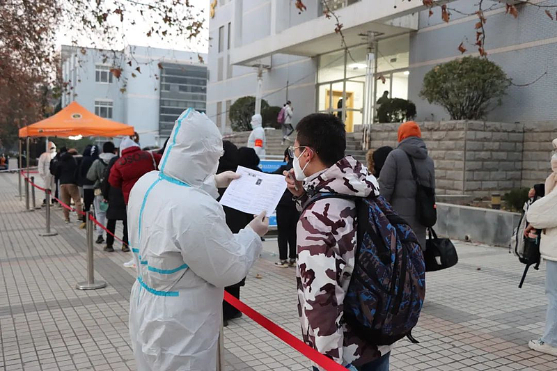 隔离考场专用通道处,学工干部已经做好准备迎接考生们的到来。他们化身“大白”,虽然行动不便,雾气遮挡了视线,但仍然不间断地向排队的考生进行温馨提醒,积极为考生答疑解惑。出示准考证和身份证,通过人脸识别查验,在工作人员的帮助下,考生们快速通过核验,有条不紊地进入考场。