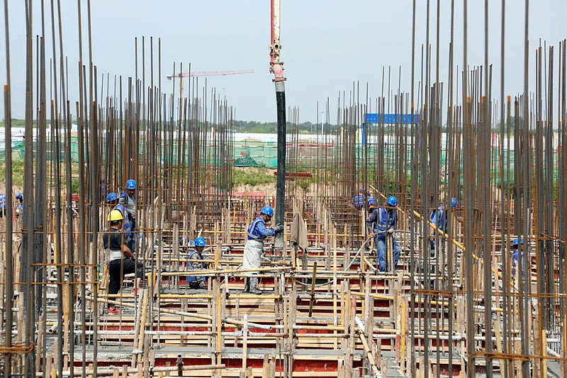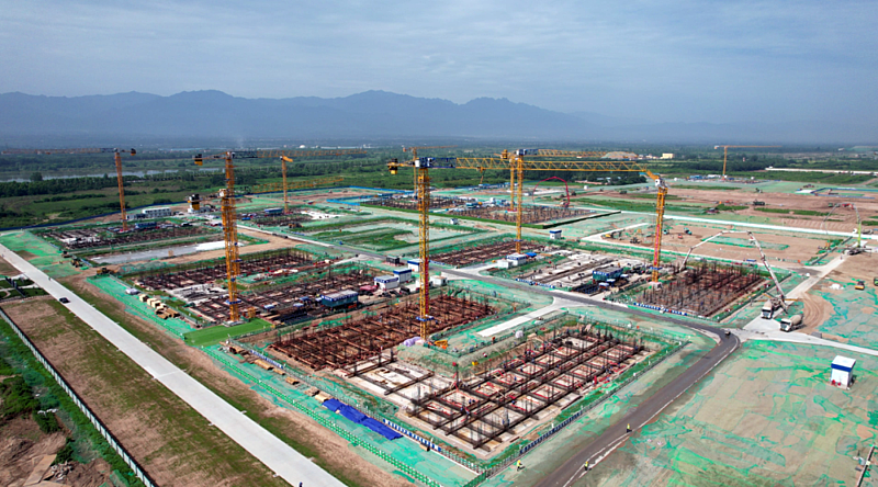 施工现场,项目二标段生产经理庄则周紧盯施工进度,500余名建设者头顶烈日、脚踩热浪、“汗”卫进度,14台塔吊铁臂来回挥舞。