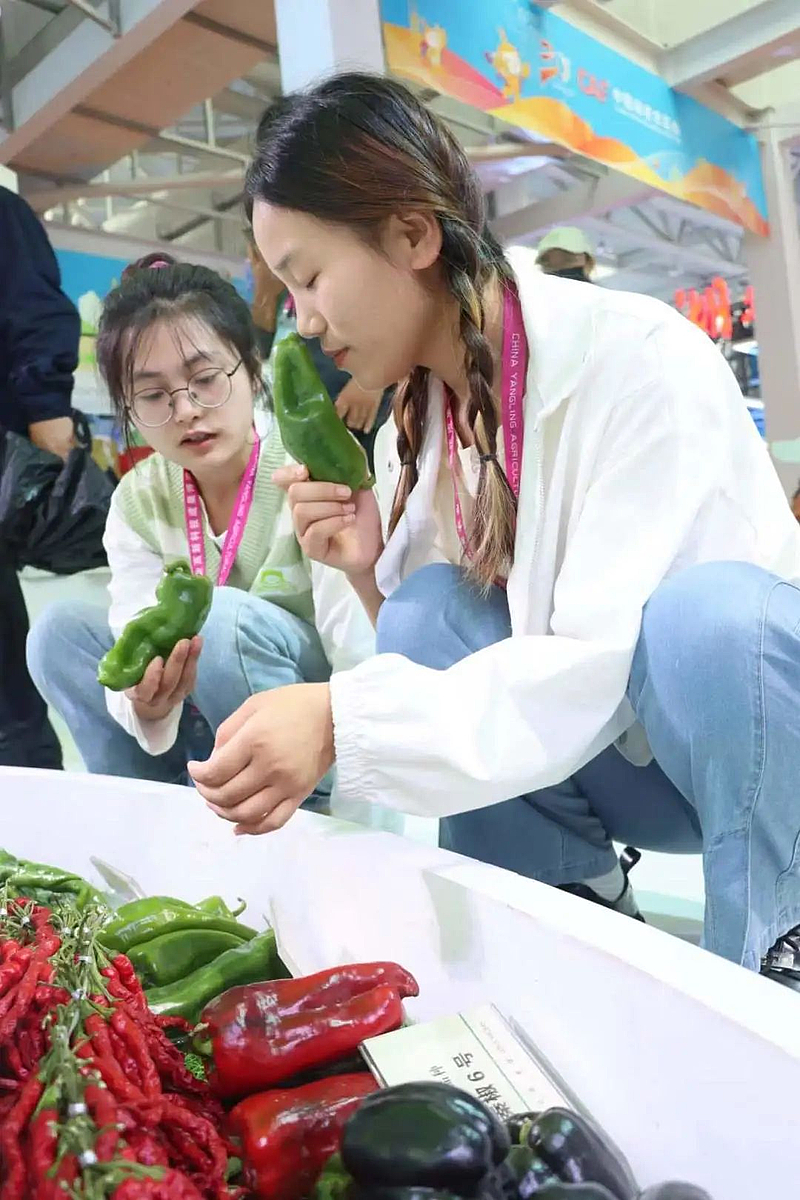西北农林科技大学学生刘灵灵(右)了解彩椒