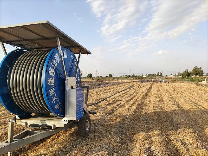 合闸,设备运转正常;抽水,田间滴头均匀出水;加压,喷头喷洒出漂亮的水线……经过几天紧张的工作,卷盘式太阳能移动喷灌机等一系列由教授朱德兰自主研发的水肥一体灌溉系统设备在乌兹别克斯坦塔什干农民内比江100公顷的农场里落户了。