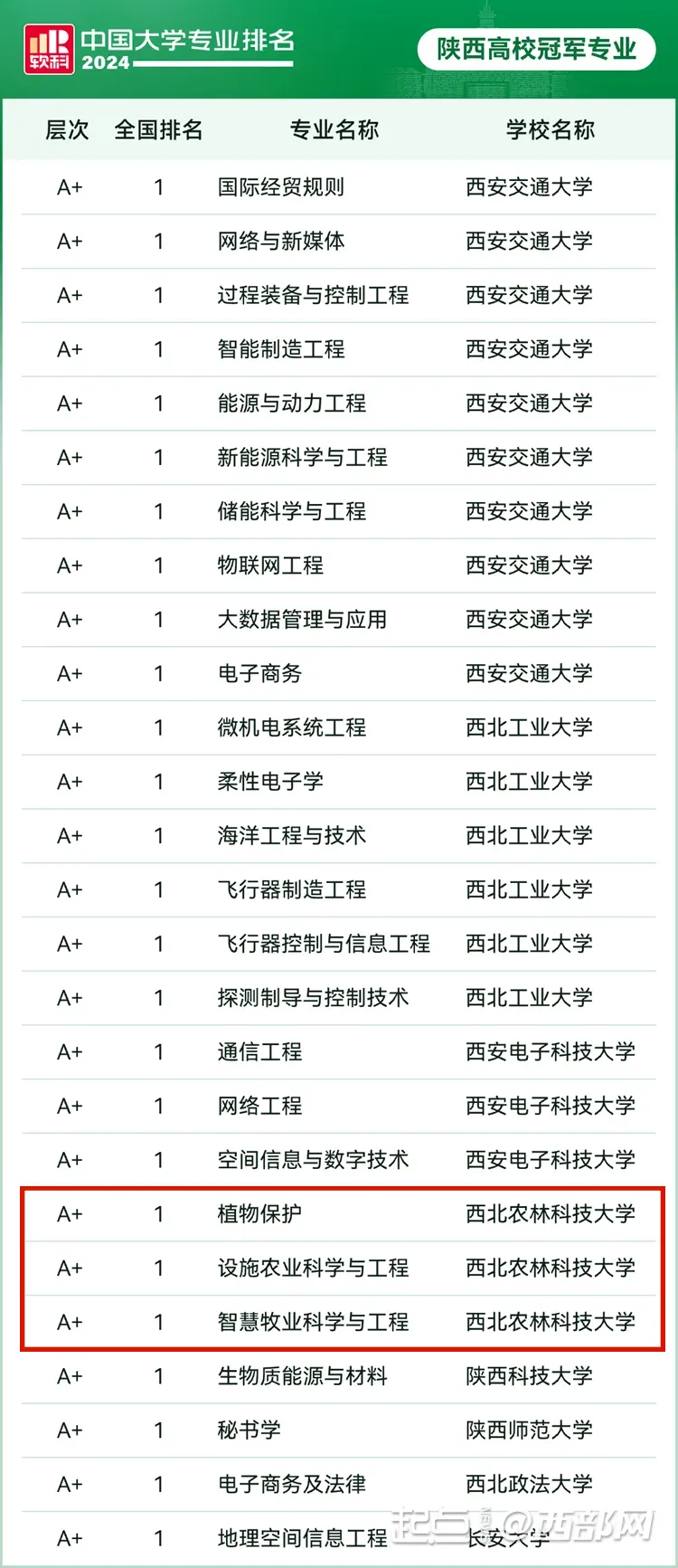 日前,高等教育专业评价机构软科发布了“2024软科中国大学专业排名”。在今年的软科中国大学专业排名中,陕西共有45所高校的1367个专业上榜,上榜专业总数位居全国第九。其中,A+专业数88个,A专业数262个,B+专业数583个,B专业数434个。陕西顶尖专业(A+)数量居全国第五,其中西北农林科技大学上榜专业占比高达100%。