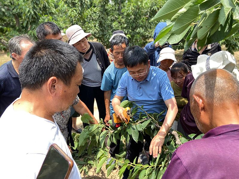 中午,蔡教授带领老百姓走进农户的樱桃种植基地,实地进行樱桃种植教学,教农户们如何剪枝,如何灌溉,如何喷药。此次培训班的成功举办,不仅增加了老百姓对种植樱桃基础知识的学习,也为一些有樱桃种植问题的农户提供了面对面的答疑的服务,当地的老百姓期待蔡教授的再次到来!