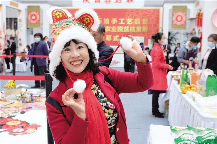 10月25日,在农高会上,逛会群众向记者展示刺绣虎头帽。 记者 田若楠 摄