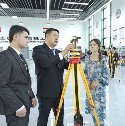 4月12日,在塔吉克斯坦首都杜尚别的鲁班工坊内,来自天津城市建设管理职业技术学院的老师吴正鹏(左二)向学生讲解测绘仪器使用方法。 奥斯帕诺夫摄(新华社发)