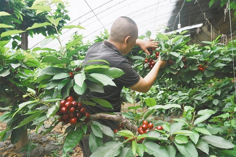 5月7日,樱桃种植户米亚军在采摘樱桃。 本报记者 王晨曦摄