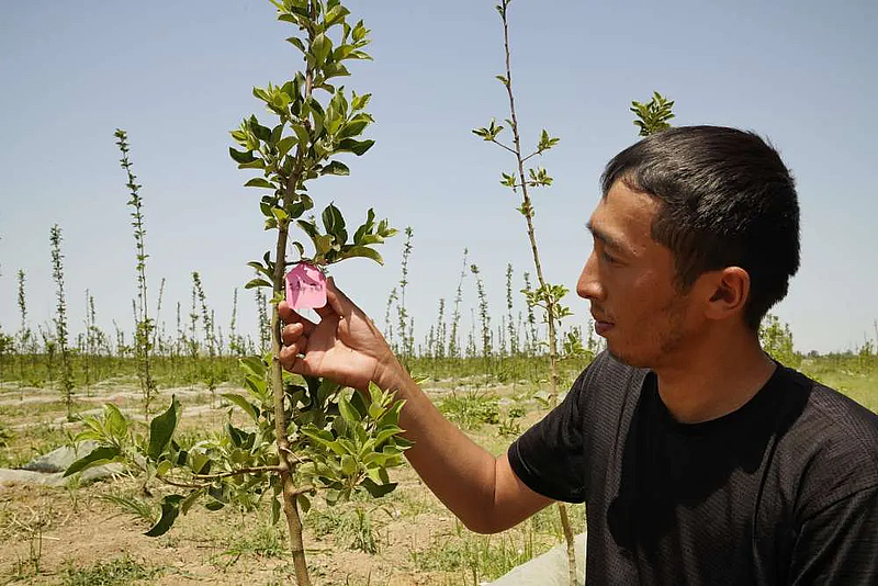 7月28日,在乌兹别克斯坦锡尔河州,园区果农沙卡尔别科夫在检查青砧苹果种苗。新华社发(扎法尔摄)