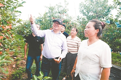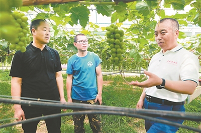 西农大合阳葡萄试验站张宗勤研究员(右)向果农介绍葡萄采收前的管理要点。