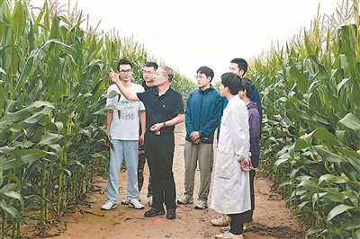 西农大旬邑玉米试验示范基地首席专家薛吉全教授(左三)同西农大学生一起查看密植高产高效栽培技术下的玉米长势情况。