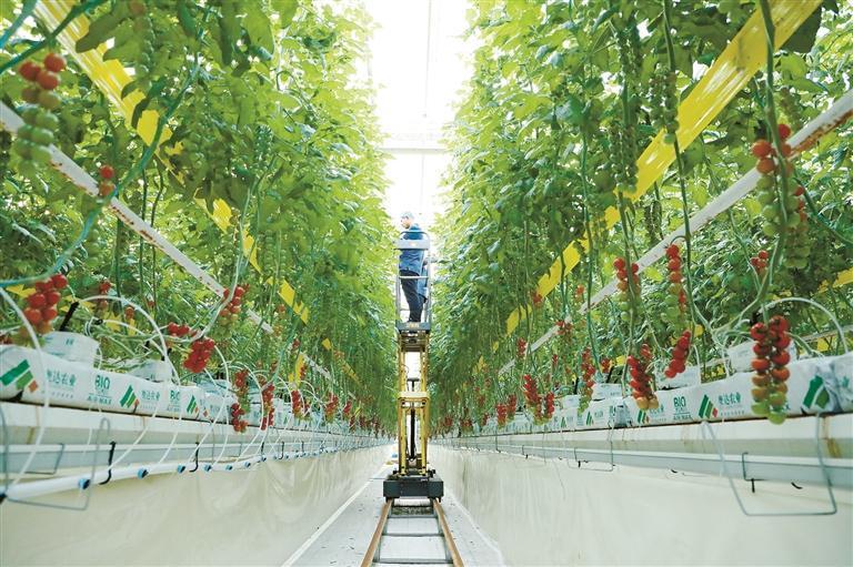 这座投资2.5亿元建成的科技产业园,总面积5万平方米,是一座集研发、生产、示范于一体的智慧农业高地,不仅是优质农产品的生产基地,还是智慧农业技术对外展示的窗口,生动诠释了新质生产力如何重塑现代农业。这里已成为一座“樱桃番茄工厂”。温室里,樱桃番茄藤蔓被牵引绳笔直吊起。成串的果实圆润饱满,像一颗颗红宝石,在智能补光灯的照射下闪烁着诱人的光泽。这里的樱桃番茄已经迎来了第五个丰收季。
