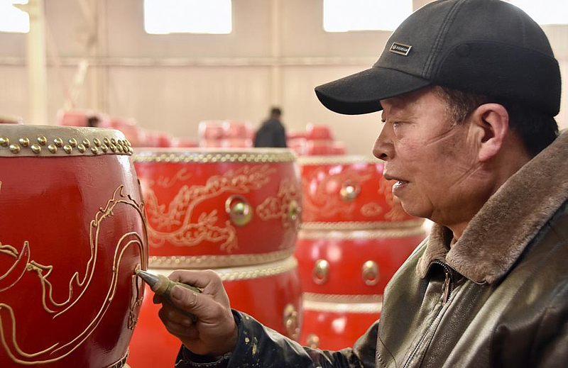 展示厅里,工匠刘从社正给鼓身上勾画出祥龙图案,走笔顺滑精妙,不一会儿,一条游龙就跃然眼前。“这个活我干了30年,画过的鼓有几万个。”他说,自己起初是名乡村画师,2015年,上川口村建起锣鼓文化产业园,刘从社就在厂里工作。
