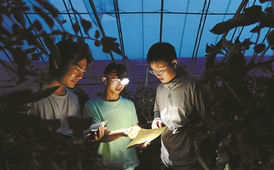 晚上,许良鹤(中)和师弟王杰(右)、封安宇到试验温室大棚里观测番茄潜夜蛾的活动习性,统计性外激素诱捕器的诱捕情况。