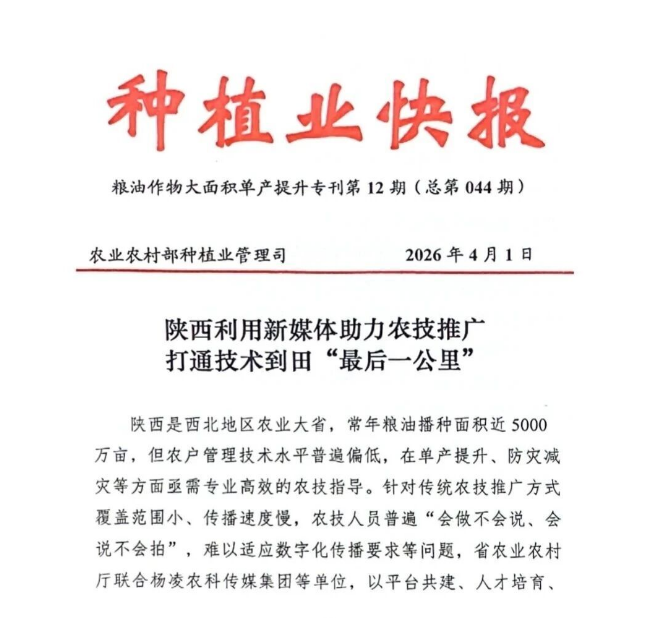 日前,《陕西利用新媒体助力农技推广打通技术到田“最后一公里”》这一典型经验,在农业农村部种植业管理司主办的《种植业快报》上刊发并在全国推广。《快报》指出,由陕西省农业农村厅联合杨凌农科传媒集团共同策划承办的“三秦农事通”线上农技指导栏目成为全省农技推广标志性品牌,为全国农技推广数字化转型提供了可复制的陕西经验。