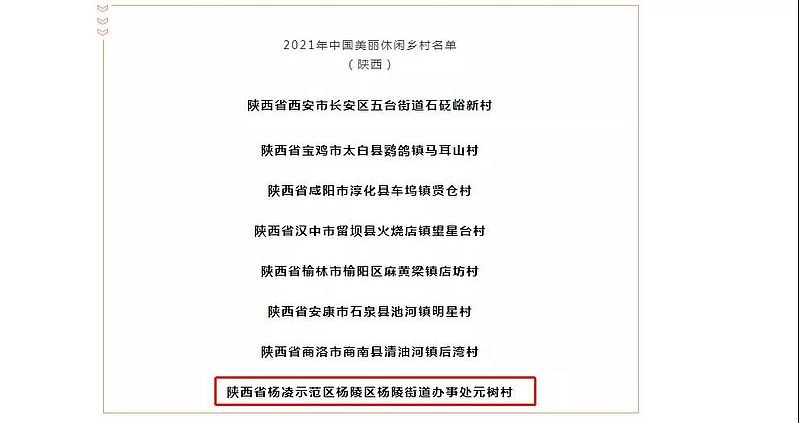11月19日,农业农村部办公厅发布《关于公布2021年中国美丽休闲乡村名单和2010—2017年中国美丽休闲乡村监测合格名单的通知》,经各省遴选推荐、专家评审和网上公示,有254个乡村被确定为2021年中国美丽休闲乡村,532个乡村被纳入2010-2017年中国美丽休闲乡村监测合格名单。其中,杨凌示范区杨陵区杨陵街道办事处元树村上榜2021年中国美丽休闲乡村名单。