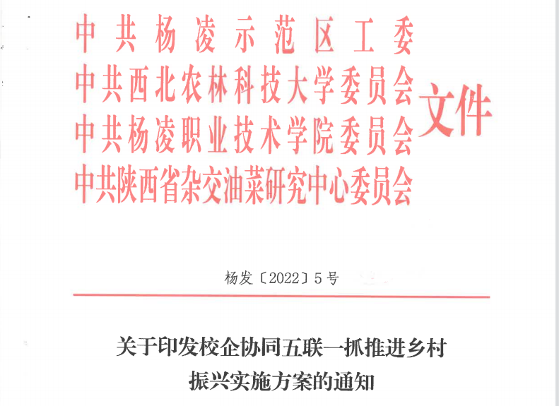 日前,杨凌示范区党工委、西北农林科技大学党委、杨凌职业技术学院党委、陕西省杂交油菜研究中心党委联合印发《校企协同五联一抓推进乡村振兴实施方案》(以下简称《实施方案》),充分发挥政校企三方资源优势,推行以驻区科教单位牵头包抓的“专家联产业、科研联生产、企业联市场、部门联政策、党员联群众、书记抓典型”的“五联一抓”工作模式,凝聚政校企协同推进乡村全面振兴的强大合力,着力打造新时代乡村振兴杨凌示范样板。