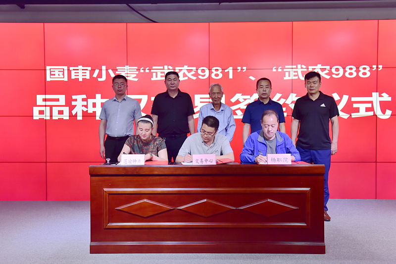 仪式上,杨凌职院科技与教育研究处、国家(杨凌)旱区植物品种权交易中心和河南开封莲瑜种业有限公司负责人共同签订了“武农981”和“武农988”小麦品种权实施许可协议。许可协议期限为一年,签约金额100万元,主要是江苏和安徽小麦主产区的生产、包装、推广和销售权许可。