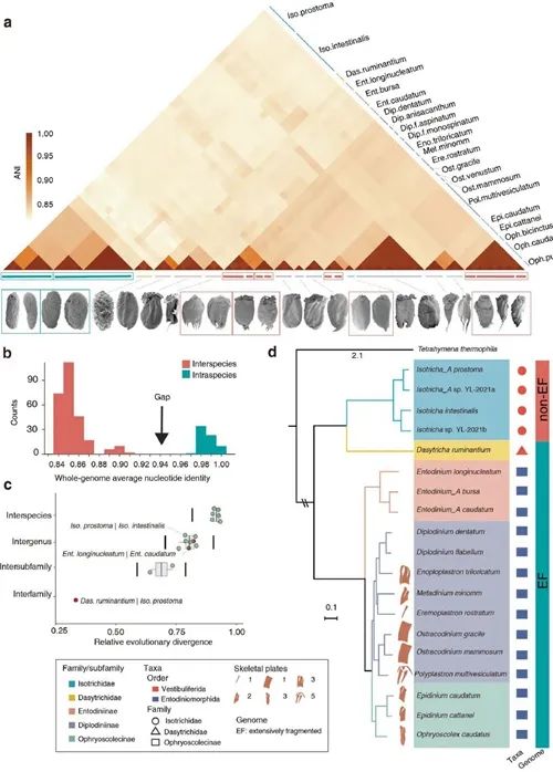 通过创建整套纤毛虫单细胞全基因组测序的组装和识别流程,共获得了奶牛、肉牛和奶山羊瘤胃中22个形态种的52个高质量基因组。其中Oph. caudatus基因组中染色体的数量估计至少有43,286条,是目前自然界中发现的染色体数量最高的物种。另外纤毛虫的片段化(一条染色体仅编码一个基因)和非片段化基因组首次在同一个纲中被发现。利用这些基因组厘清了瘤胃纤毛虫的分类学和系统发育框架,将22个形态种修改为19个物种和13个属。其中1个新的科、2个新的属、9个同义物种和2个隐形物种被发现。对901个已发表的瘤胃宏基因组数据用本基因组集重新分析发现,纤毛虫的reads在宏基因组中可高达72%,极大地促进了宏基因组数据中暗物质的解析。