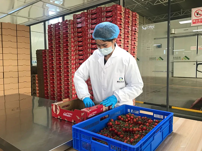 走进这座智能连栋温室,红彤彤的串番长势正旺。工人们或在高空采摘车上采摘,或在包装区分拣、贴标、装盒,有秩序地忙碌着。