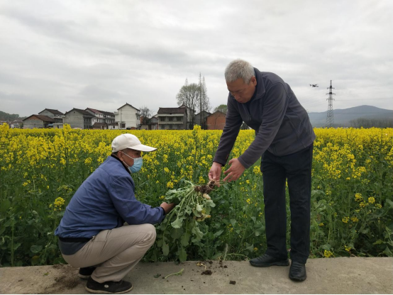 ▲任军荣(左)和董育红(右)在田间观察油菜植株的根部