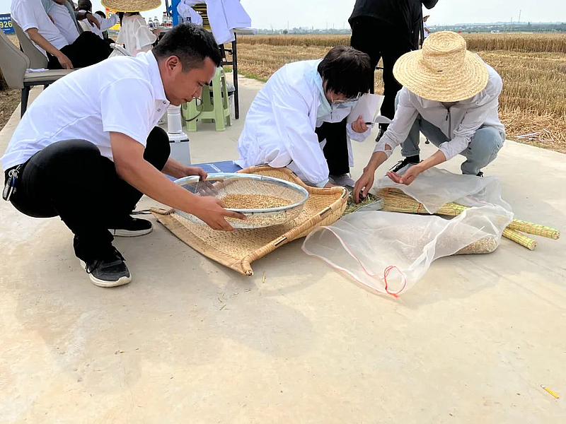 在试验田地头,摆放着百米尺、跑尺、簸箕、筛子谷物水分测量仪以及称重类器具。测产现场严格按照《全国粮食高产创建测产验收办法(试行)》进行实收测产,经过实际丈量收获面积、收割机实收、称重、水分测定、取样测杂质率等环节后称重并计算出产量。